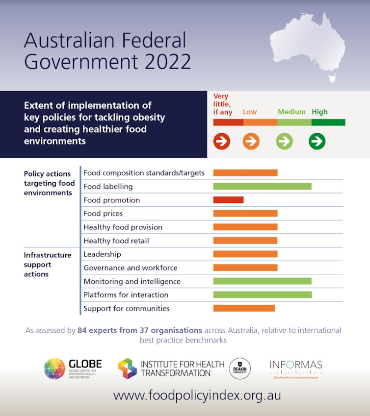Our assessment of the federal government included a scorecard of how Australia is going in 50 policy areas for addressing unhealthy diets. These policy areas include key influences on what we buy and what we eat, including policies that affect the price and affordability of different foods, the types of food available, how food is labelled, and the way food is promoted.